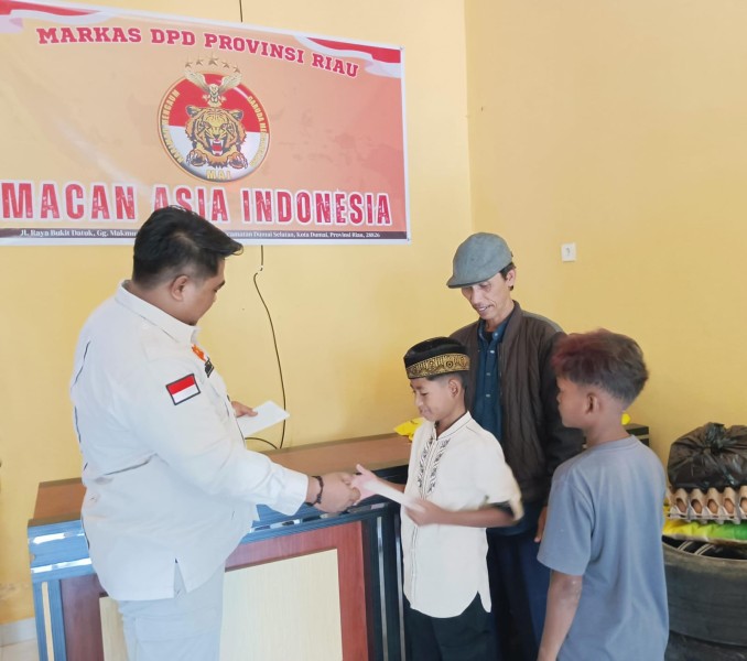 DUMAI (MR) - DPD Macan Asia Indonesia Provinsi Riau menggelar kegiatan sosial berupa pemberian santunan kepada anak yatim dan kaum dhuafa di Markas Besar yang berlokasi di Jalan Bukit Datuk.