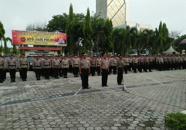 PEKANBARU (MR) - Kapolda Riau, Irjen Pol Zulkarnain Adinegara, pimpin langsung Upacara Utama di halaman Mapolda Riau, Senin (1/5/2017). Acara ini, sekaligus memberikan penghargaan kenaikan pangkat kepada seorang Pejabat Tinggi (Pati) serta dua Perwira Menengah (Pamen), yang sebentar lagi pensiun.