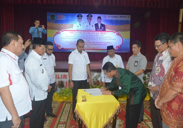 INDRAGIRI HILIR (MR) - Bupati Kabupaten Indragiri Hilir (Inhil), HM Wardan menandatangani nota kesepahaman (MoU) pembayaran Pajak Bumi dan Bangunan (PBB) dengan sejumlah institusi, seperti PT Pos Indonesia (Persero), PT Bank Rakyat Indonesia, PT Bank Riau - Kepri dan PT PLN (Persero) Area Rengat di Gedung Engku Kelana, Tembilahan, Rabu (24/5/2017) pagi.
