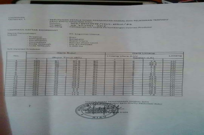Dikatakan Misliadi Informasi yang dirangkum menyebutkan bahwa izin yang dikeluarkan oleh pemerintah propinsi riau melalui Dinas Penanaman Modal dan Pelayanan Terpadu nomor 503/DPMPTSP/IZIN-ESDM/66 tertanggal 29 maret 2017 kepada PT. Logomas Utama seluas 5.030 HA di perairan Rupat Utara kabupaten Bengkalis termasuk didalamnya sebagian kecil pulau Beting Aceh dan Separuh dari Pulau Babi.