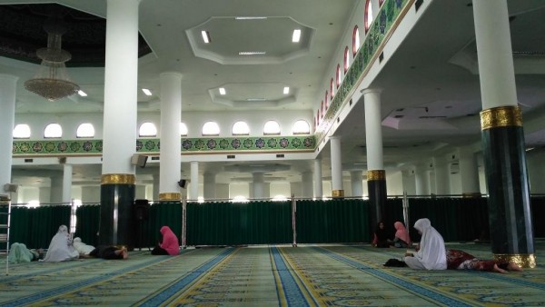 Suasana masjid saat ini terlihat para jamaah silih berganti berdatangan untuk melaksanakan salat. Bahkan pada lorong masjid tampak pengunjung duduk bersantai.