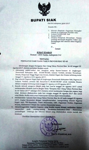 SIAK (MR) - Dalam rangka memeriahkan HUT Kemerdekaan Republik Indonesia ke 72 dan Hari jadi Provinsi Riau ke 60, Pemerintah Kabupaten Siak menerbitkan dua Surat Edaran terkait Himbauan Partisipasi Menyemarakkan Bulan Kemerdekaan dan Peringatan HUT Riau. Melalui himbauan itu, masyarakat Kabupaten Siak diminta untuk ikut berpartisipasi aktif memeriahkan dua perayaan tersebut dengan memasang atribut merah putih dan terlibat dalam sejumlah kegiatan bersama.
