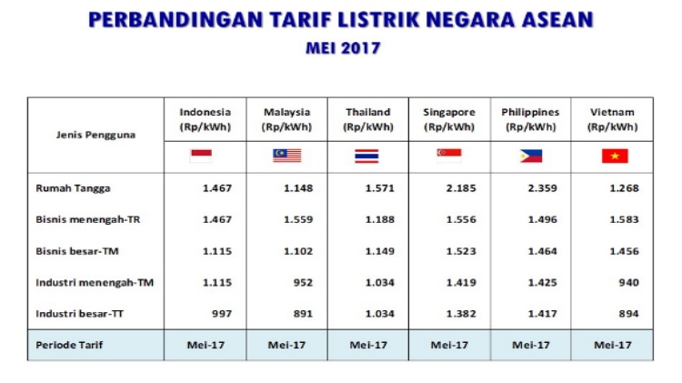 Ia menyebutkan, sesuai data Direktorat Jenderal Ketenagalistrikan, untuk periode tarif bulan Mei 2017, untuk pelanggan bisnis besar, tarifnya adalah Rp1.115 per kWh, sementara Thailand Rp1.149 per kWh, Singapura Rp1.523 per kWh, Filipina Rp1.464 per kWh, dan Vietnam Rp1.456 per kWh.