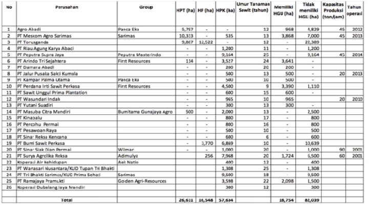 Dan kata Okto lagi hal ini berdasarkan investigasi di 26 korporasi sawit yang luasnya 100.093 hektar. Sekitar 0,06 persen dari total 1.638.249 hektar yang dijadikan perubahan peruntukan kawasan hutan menjadi bukan kawasan hutan di Provinsi Riau berdasarkan Keputusan Menteri Kehutanan Nomor 673/Menhut-II/2014 tanggal 8 Agustus 2004, Tentang Perubahan Peruntukan Kawasan Hutan Menjadi Bukan Kawasan Hutan.