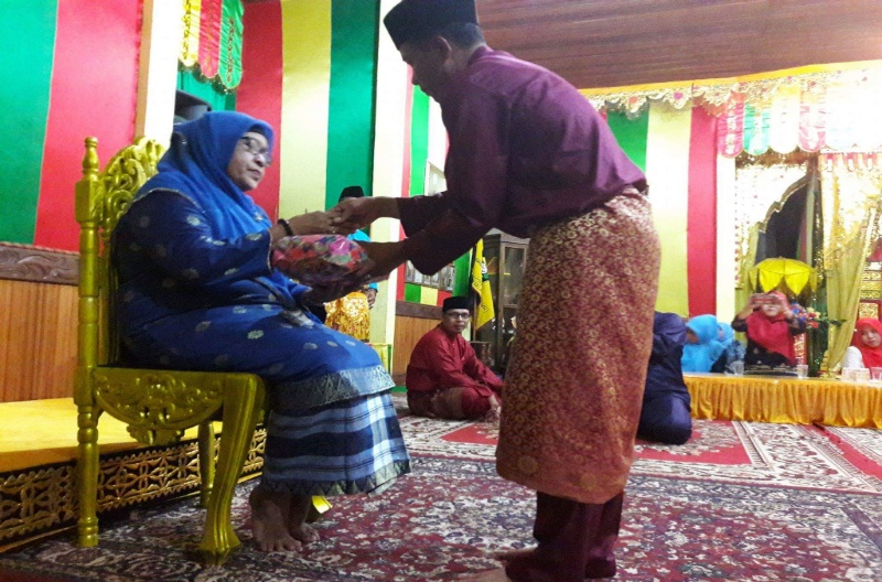Tampak Acara adat istiadat meminta maaf yang digelar di gedung LAMR Kecamatan dilakukan berbagai macam Acara salah satu nya sungkeman kepada Ibu Arlina dari PJ. Kades Batang Dui Nazrin, tepuk tepung tawar dan membayar dengan seekor kambing.