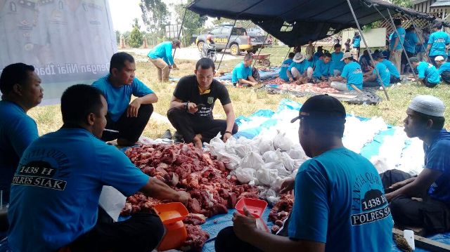 SIAK (MR) - Iedul Adha tahun ini, Mapolres Siak menyembelih sembilan (9) ekor sapi qurban. DagingbQurban langsung didistribusikan kepada warga sekitar serta melalui beberapa Mushala yang berada di sekitar Mapolres.