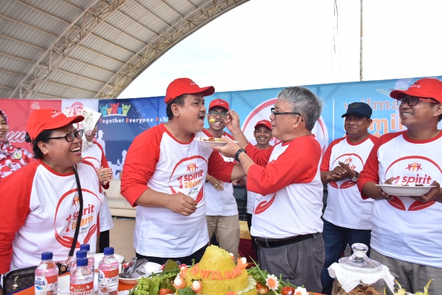 GM Wilmar, Tenang Sembiring menerima suapan nasi tumpeng dalam syukuran Anniversary ke 26 Wilmar Dumai-Pelintung. (Foto: Toy Jepreter)