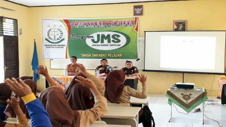 SENTAJO RAYA (MR) - Siswa-siswi SMPN 2 Sentajo Raya sangat antusias mengikuti kegiatan Jaksa Masuk Sekolah (JMS) yang digelar Kejaksaan negeri (Kejari) Kuantan Singing.