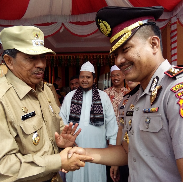 AKBP Restika P Nainggolan SIk berjabat tangan dengan wakil Bupati Siak Drs H Alfedri MSi usai sertijab dirinya dengan AKBP Barliansyah SIK