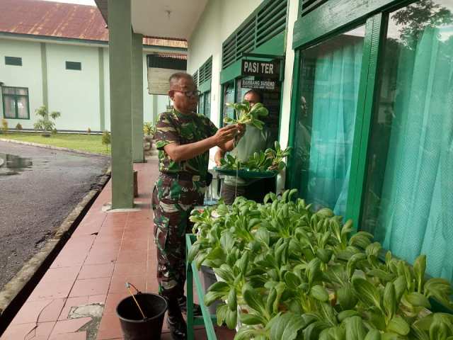 Pasiter Kodim 0320/Dumai, Kapten Arh Bambang Suseno sedang mereawat tanaman hidroponik