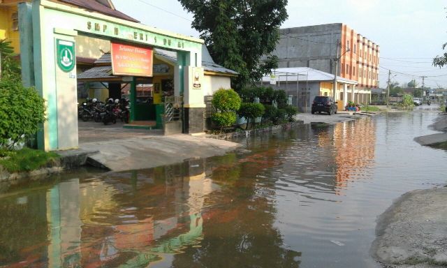 Jalan Tenaga, tepatnya di di depan SMP Negeri 1 Dumai, terlihat tergenang air.