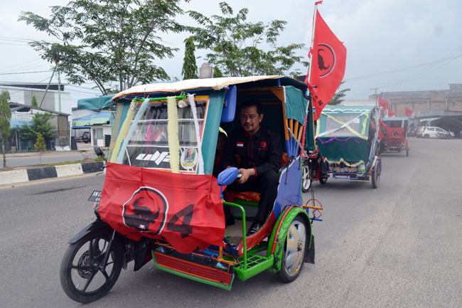 DUMAI (MR) - Pengurus Dewan Pimpinan Cabang (DPC) Partai Demokrasi Indonesia (PDI) Perjuangan naik becak motor ke kantor Komisi Pemilihan Umum (KPU) untuk menyerahkan berkas pendaftaran.