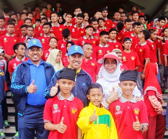 Bufon dan atlet Porprov foto bersama dengan Bupati dan Wakil Bupati Siak serta Ketua PKK kabupaten Siak