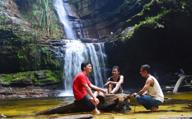 Terlihat Tim kemudian berjalan menuruni bukit dan kemidian memasuki kawasan hutan, tak lama berjalan, suara riak air terjun sudah mulai terdengar, menandakan objek wisata sudah dekat. Dan benar, tak sampai 10 menit berjalan, tim sudah disuguhkan dengan panorama yang begitu indah, terdapat air terjun kecil atau yang ketinggianya tak sampai 2 meter.