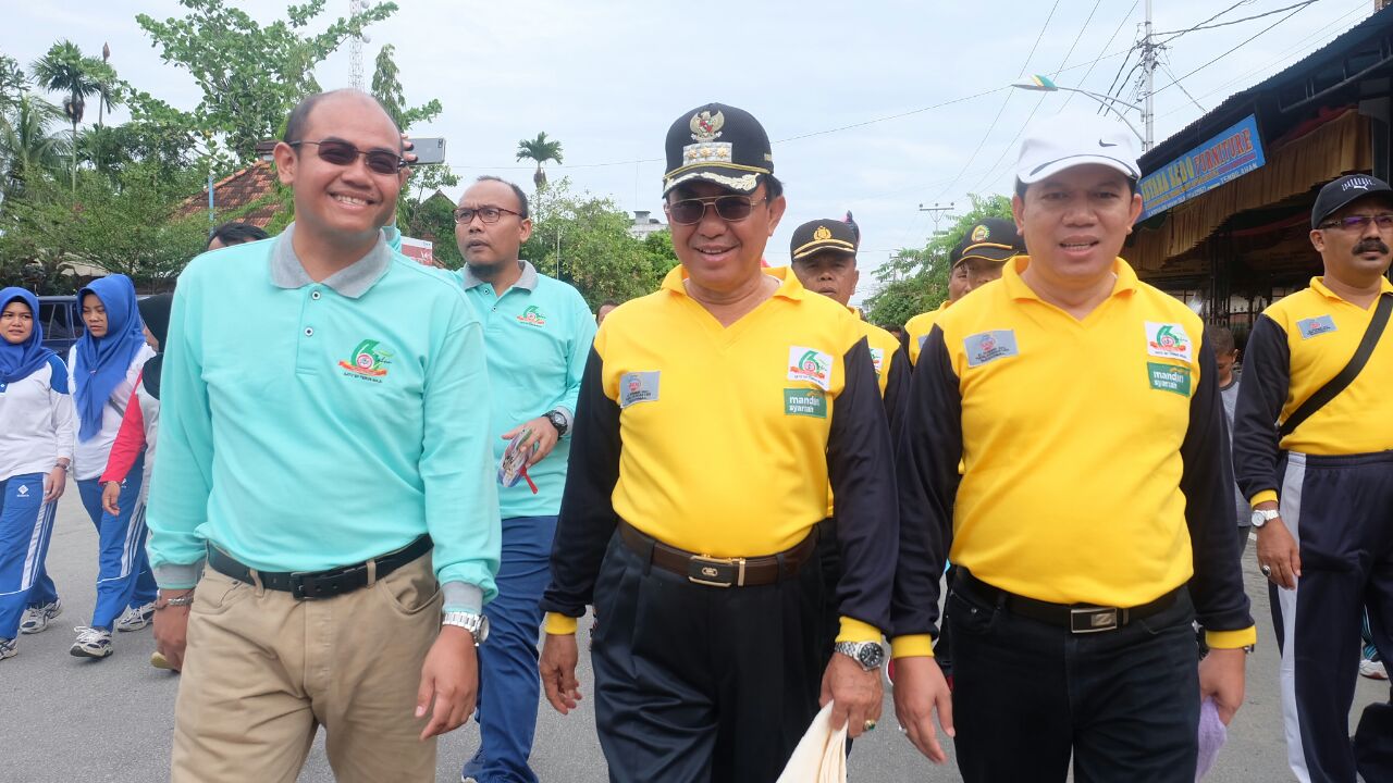 TEMBILAHAN (MR) - Bupati Kabupaten Indragiri Hilir (Inhil), HM Wardan mengikuti kegiatan jalan sehat yang ditaja Dinas Kesehatan bekerjasama dengan Tim Penggerak PKK Kabupaten Inhil dalam rangka memperingati Hari Kesehatan Nasional (HKN) Ke - 53 di lapangan Gajah Mada, Tembilahan, Minggu (12/11/2017) pagi.