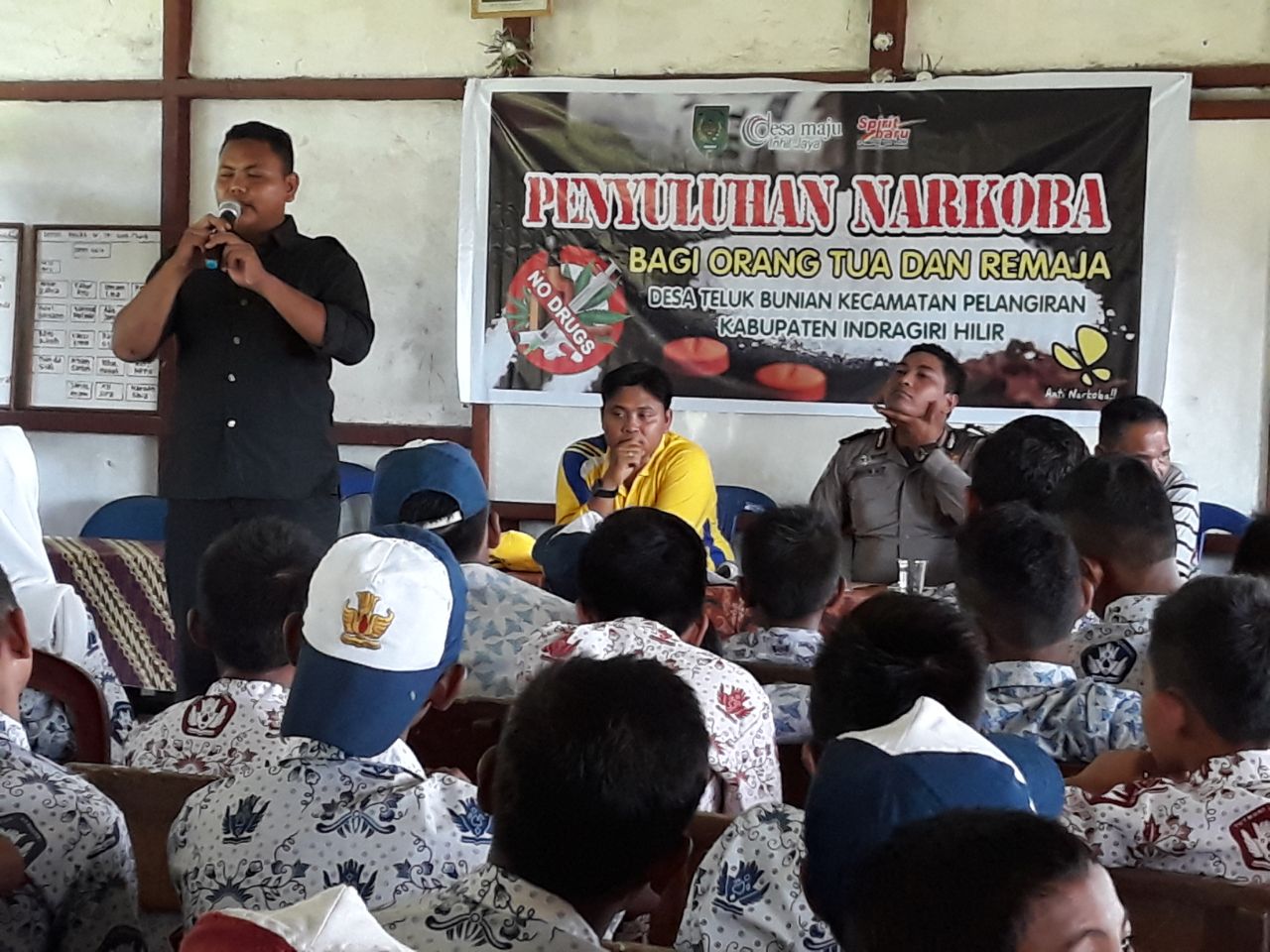 TEMBILAHAN (MR) - Pemerintah Desa (Pemdes) teluk bunian menggandeng pihak kepolisian sektor (Polsek) Pelangiran mengadakan sosialisasi Narkoba terhadap orang tua dan anak remaja dan Kekerasan Dalam Rumah Tangga (KDRT), Rabu (15/11/2017) di gedung SDN 005 Teluk Bunian.