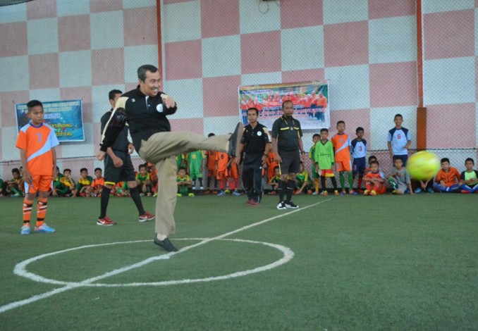 SIAK (MR) - Bupati Siak, Syamsuar, membuka secara resmi tournament Futsal SDN 01 Siak Lanjut Cup V Tahun 2017 yang dilaksanakan di lapangan Futsal Sapta Taruna, Senin (11/12/17).