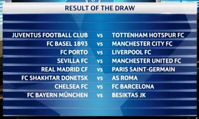 Pada undian itu, terdapat dua laga besar antara Real Madrid kontra Paris Saint-Germain (PSG) dan Chelsea lawan Barcelona. Tim-tim yang menjadi runner-up pada fase grup akan lebih dahulu bertindak sebagai tuan rumah.