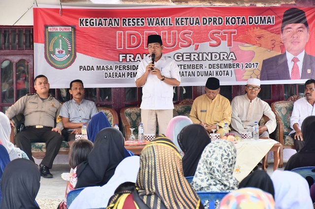 DUMAI (MR) - Wakil Ketua DPRD Kota Dumai Idrus, ST melakukan reses masa persidangan III (September sd Desember) di Gang Becek Kelurahan Bintan Kecamatan Dumai Kota, Kamis (14/12/2017).