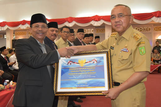 Penghargaan bersama 9 kabupaten/kota se-Provinsi Riau diberikan Gubernur Riau (Gubri) Arsyadjuliandi Rahman kepada Bupati Bengkalis yang diwakili Pelaksana Tugas (Plt) Sekretaris Daerah (Sekda) H. Arianto, Senin (18/12/17).