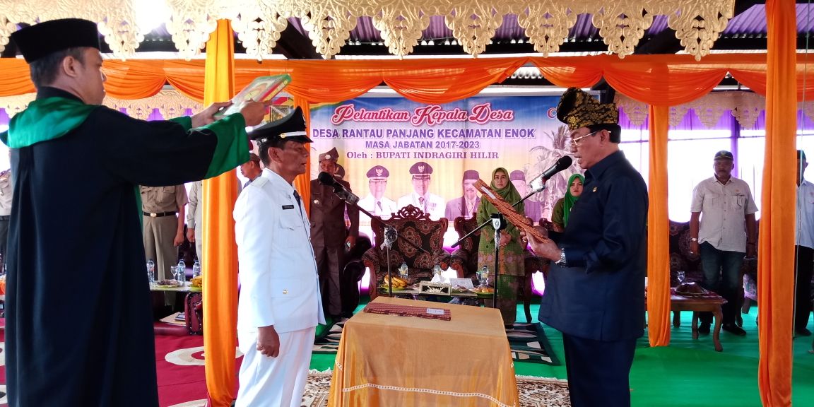 TEMBILAHAN (MR) - Bupati Indragiri Hilir (Inhil), HM Wardan mengambil sumpah jabatan sekaligus melantik Kepala Desa (Kades) Rantau Panjang, Kecamatan Enok, Kamis (18/01/2018).