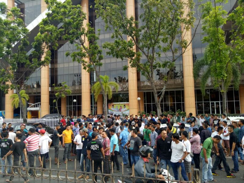 Aksi kekerasan dan intimidasi ini ratusan sopir taksi online melakukan aksi solidaritas di jalan Cut Nyakdien, tepatnya Perpustakaan Soeman HS.