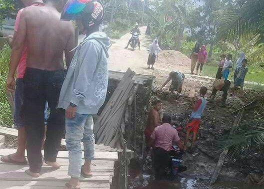 TEMBILAHAN (MR) - Jembatan parit 6 Desa Sungai Luar Kecamatan Batang Tuaka ambruk, Senin (22/1/2018) sekitar pukul 12.00 WIB.