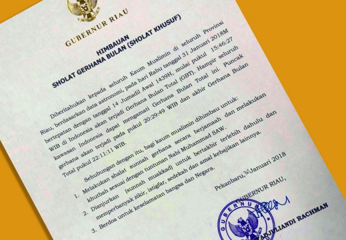 "Sehubungan dengan itu, kami mengimbau kepada seluruh kaum muslimin di provinsi Riau untuk melaksanakan salat sunnah gerhana secara berjemaah dan melakukan khutbah sesuai dengan tuntunan Nabi Muhammad SAW," imbuh Gubernur Riau, H Arsyadjuliandi Rachman, Rabu (31/1/2018).