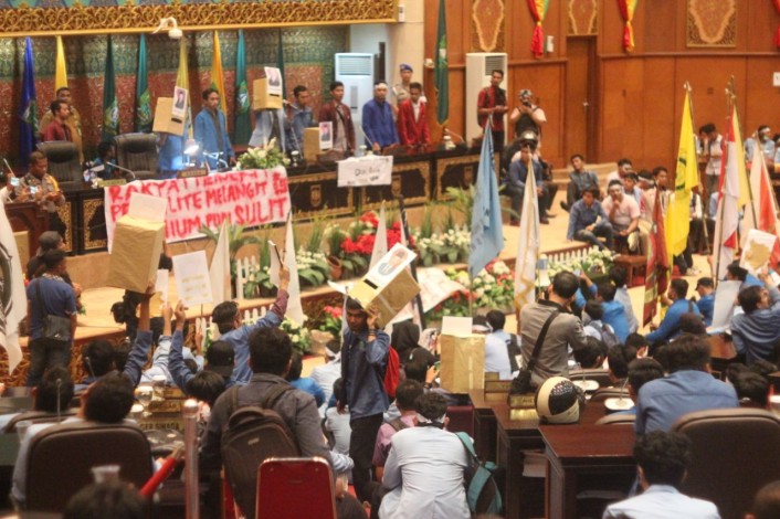 Setelah berkumpul di depan Gerbang Gedung DPRD Riau sekitar 15.00, ribuan mahasiswa yang tergabung dalam Aliansi BEM se-Riau memaksa masung ke gedung DPRD Riau. Setelah terjadi aksi saling dorong dengan petugas keamanan, akhirnya kelompok mahasiswa berhasil masuk ke gedung DPRD Riau.