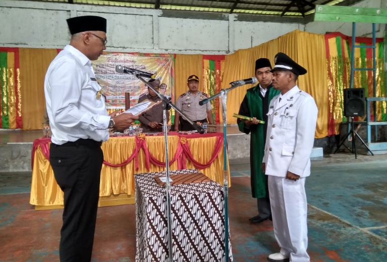 TEMBILAHAN (MR) - Penjabat (Pj) Bupati Kabupaten Indragiri Hilir (Inhil), Rudyanto melantik Penjabat (Pj) Kepala Desa (Kades) Simpang Tiga Daratan Kecamatan Enok di aula Kantor Camat Enok, Jum'at (16/3/2018).
