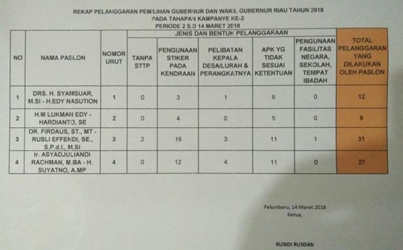 Kemudian Rusidi merincikan hasil rekap pelanggaran pasangan peseta Pilkada Riau di masa kampanye kedua. Adalah "Sesuai dengan data tersebut, ke depannya kita minta agar tidak terjadi lagi pelanggaran seperti itu, ya kampanye lah sesuai aturan," cakapnya lagi. Sementara itu, dari rekapitulasi pelanggaran yang dirilis Bawaslu diketahui Pasangan Firdaus-Rusli Effendi melakukan pelanggaran terbanyak, yakni 31 pelanggaran. Sementara pasangan calon yang paling sedikit melakukan pelanggaran adalah pasangan Lukman Edy-Hardianto dengan 9 pelanggaran.