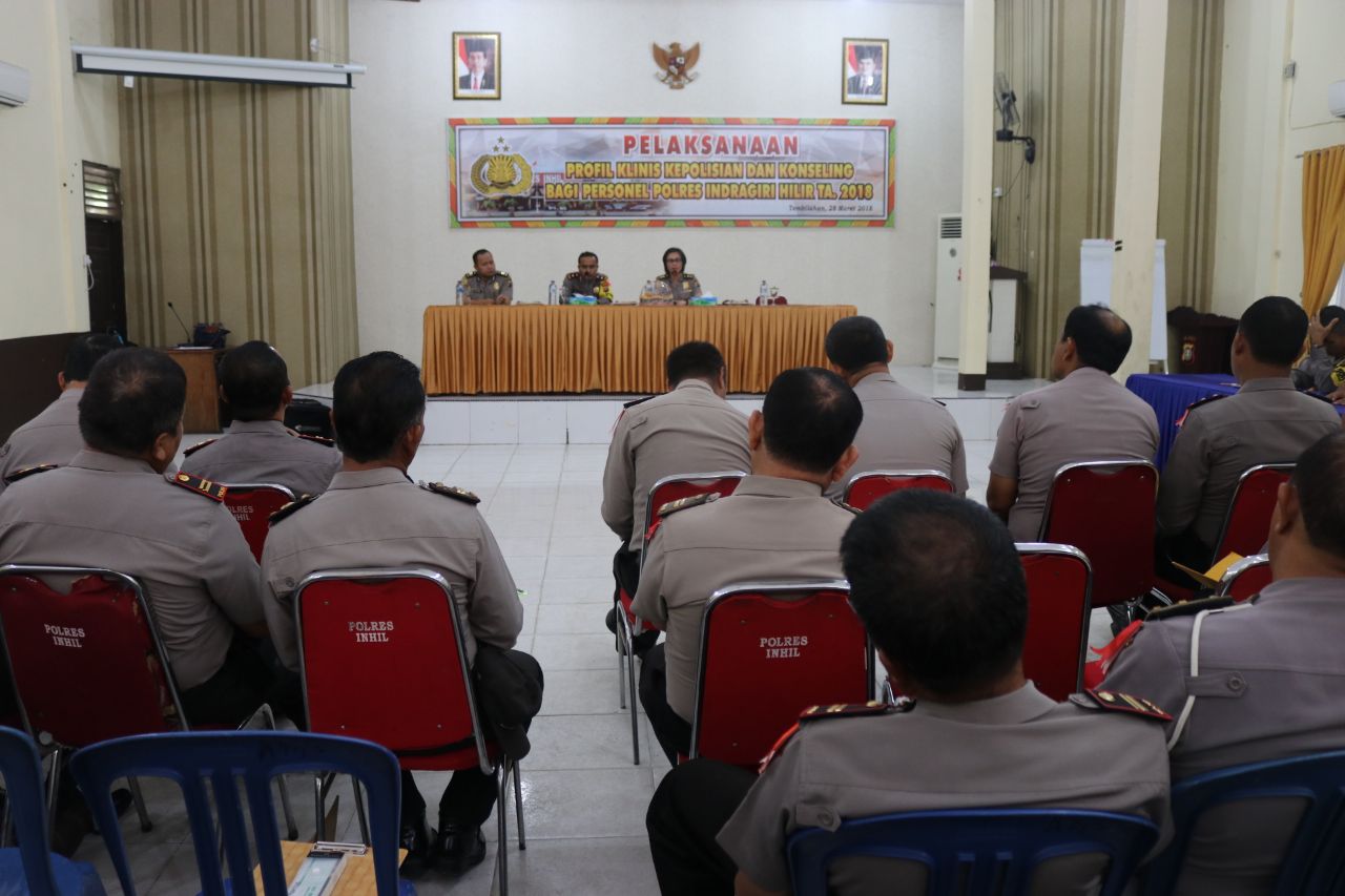 TEMBILAHAN (MR) - Polres Indragiri Hilir (Inhil) menggelar kegiatan profil klinis Kepolisian dan Konseling bagi Personel Polres di Aula Bhakti Rekonfu Polres Inhil, Jalan Gadjah Mada, Tembilahan, Rabu (28/3/2018).