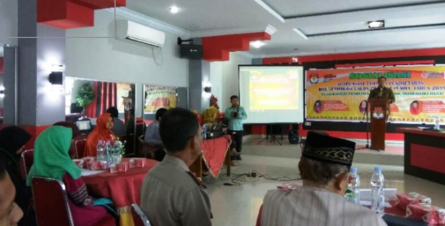 INHU (MR) - Komisi Pemilihan Umum (KPU) Kabupaten Indragiri Hulu laksanakan sosialisasi tahapan penyelenggaraan pemilihan legislatif dan pilpres pada 2019 mendatang. Acara dilaksanakan di aula wisma Happy kecamaran Rengat Barat, Selasa (4/4).