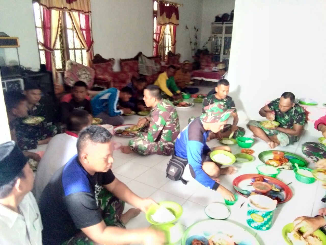 TEMBILAHAN (MR) - Kedekatan dan kebersamaan TNI dan Masyarakat dalam menjalankan kegiatan Tentara Manunggal Membangun Desa (TMMD) yang ke-101 Tahun 2018 Komando Distirik Militer (Kodim) 0314/Kabupaten Indragiri Hilir (Inhil) tidak hanya terlihat pada saat mengerjakan titik sasaran, tetapi warga juga tidak sungkan mengundang para Tentara untuk makan siang bersama.