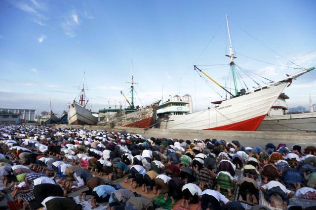 Umat muslim menunaikan Shalat Idul Fitri 1438 Hijriah di Pelabuhan Sunda Kelapa, Minggu (25/6/2017).