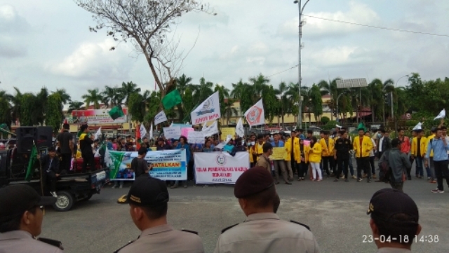PEKANBARU (MR) - Ratusan massa yang tergabung dalam Aliansi Penolakan Waduk Rokan menggelar aksi penolakan pembangunan Waduk Lompatan Harimau di Kabupaten Rokan Hulu (Rohul), Provinsi Riau, Senin (23/4/2018) di Kantor Gubernur Riau.