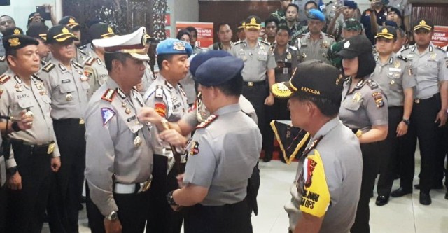PEKANBARU (MR) - Kapolri Jenderal Tito Karnavian memuji aksi Dirlantas Polda Riau Kombes Rudy Syafruddin menembak mati 3 orang terduga teroris di Mapolda Riau. Rudy pun diberi penghargaan pin emas.