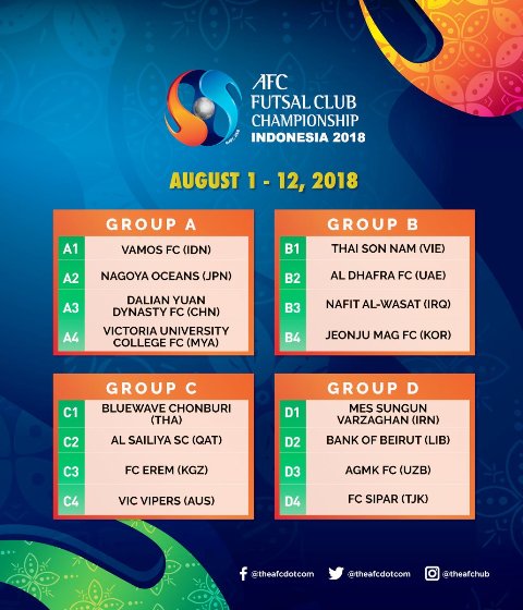 Dalam undian yang dilakukan siang ini, Vamos FC menempati Grup A AFC Futsal Club Championship 2018. Mereka akan bertemu Nagoya Oceans (Jepang), Dalian Yuan Dynasty (China), dan Victoria University College (Myanmar).