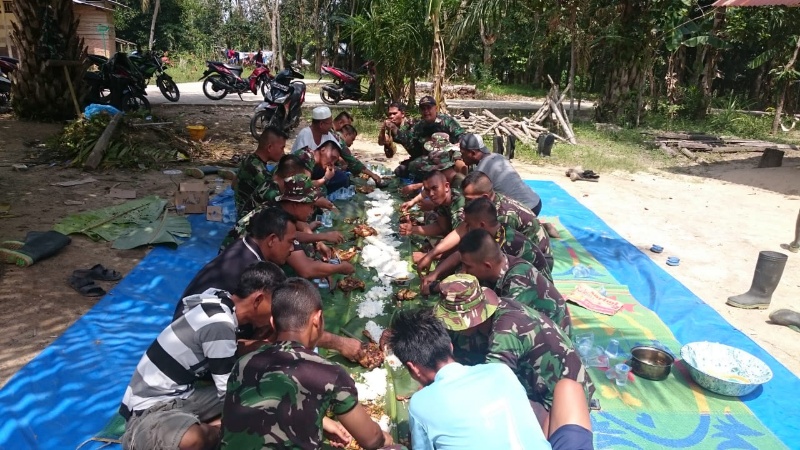 DUMAI (MR) - Kemanunggalan TNI-RAKYAT tidak hanya diperlihatkan oleh Prajurit TNI yang tergabung dalam Satgas TMMD ke 102 Kodim 0320/Dumai yang berlokasi di Kelurahan Kampung Baru Kec. Bukitkapur Kota Dumai, akan tetapi indahnya Kemanunggalan TNI-RAKYAT terlihat ketika makan siang bersama denga hanya beralaskan daun pisang.