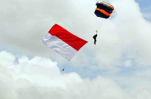 Teks foto: Atraksi terjun payung membawa bendera Merah Putih