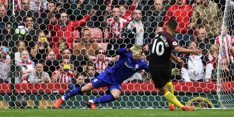 City mendapatkan hadiah penalti menyusul dilanggarnya Nicolas Otamendi oleh Ryan Shawcross di kotak terlarang. Aguero yang maju sebagai algojo sukses menjaringkan bola ke gawang Stoke yang dikawal Shay Given.