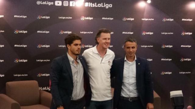Rodrigo Gallego Abad selaku delegate of LaLiga Global Network Indonesia (kanan), Ivan Codina selaku managing director of LaLiga southeast Asia, Jepang, dan Korea Selatan (kiri), dan Steve McManaman, mantan pemain Real Madrid yang sekaligus Duta LaLiga (te