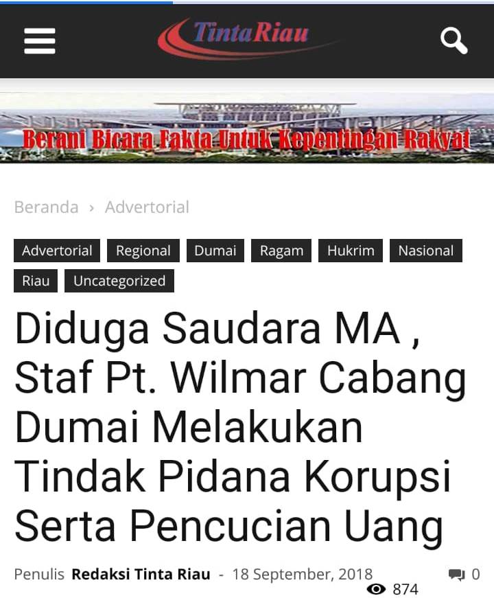 DUMAI (MR) - MA, Staf Humas PT.Wilmar Grup Dumai menyampaikan hak jawabnya kepada media online Tintariau.com, terkait berita berjudul "Diduga Saudara MA, Staf Pt.Wilmar Cabang Dumai Melakukan Tindak Pidana Korupsi Serta Pencucian Uang" pada 18 September 2018 lalu.