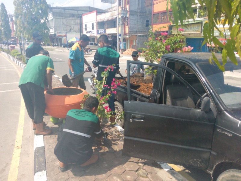 Terlihat beberapa petugas pertamanan DLH memasukkan satu persatu pot yang sudah ada dengan pohon bunga dan disusul dengan memasukkan tanah yang sudah dicampur pupuk sebelumnya.