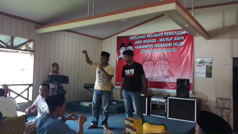 TEMBILAHAN (MR) - Para pendukung Calon Presiden dan Wakil Presiden Joko Widodo (Jokowi) – Ma’ruf Amin di Kabupaten Indragiri Hilir (Inhil) yang tergabung dalam Relawan pemenangan Jokowi-Amin Kabupaten Inhil menggelar dekelarasi, Minggu (7/10/2018) kemarin.