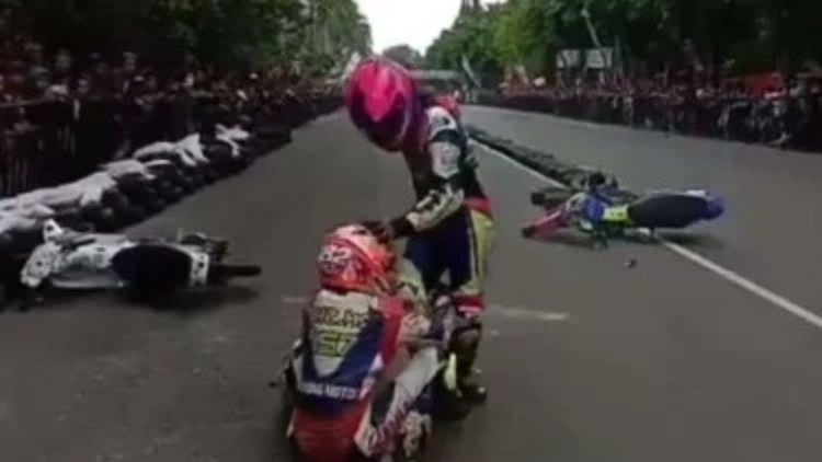 Pembalap yang terjatuh bukannya langsung keluar lintasan, tetapi tetap berada di lintasan dan menunggu pembalap yang membuatnya terjatuh. Ketika datang, dia pun langsung melempar karung pembatas ke arah sang rival hingga terjatuh dan kemudian terlibat perkelahian.*** (viva)
