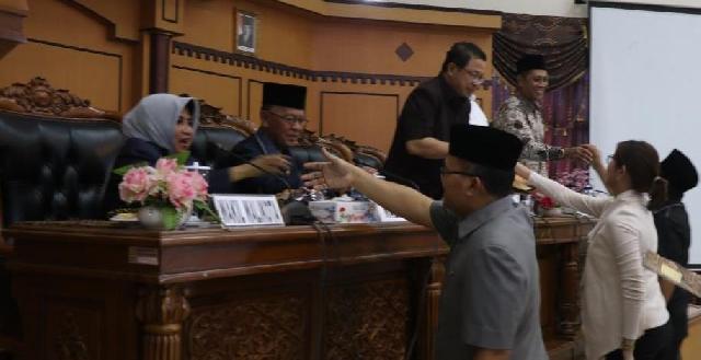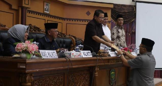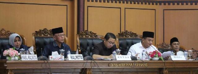 Wali Kota Tanjungpinang, H Syahrul, didampingi Wakil Wali Kota Tanjungpinang, Hj. Rahma, S.IP, memberikan jawaban terhadap Pandangan Umum Fraksi terkait 6 (enam) Ranperda Kota Tanjungpinang 2019, kepada Ketua DPRD Kota Tanjungpinang Suparno, Wakil Ketua I