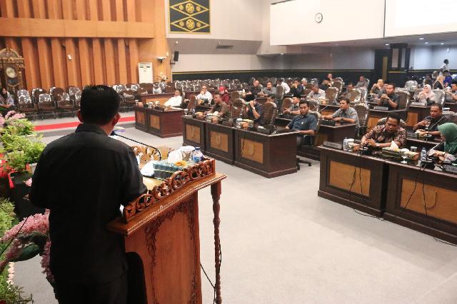 Tampak dari depan di ruang paripurna, para anggota DPRD Pekanbaru serius mengikuti rapat paripurna susunan nama-nama Fraksi di DPRD Kota Pekanbaru periode 2019-2024.