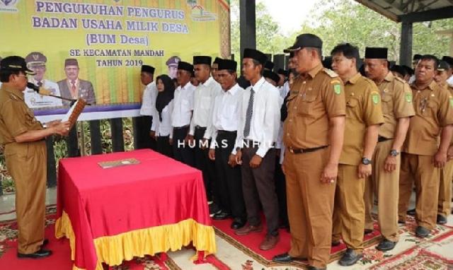 TEMBILAHAN (MR) - Bupati Indragiri Hilir (Inhil) HM Wardan mengukuhkan pengurus Badan Usaha Milik Desa (BUMDes) se-Kecamatan Mandah, Selasa (8/10/2019).