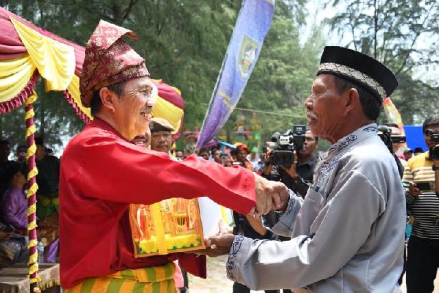 Bupati Bengkalis Amril Mukminin berikan bingkinsan kepada penggagas Festival Mandi Safar.